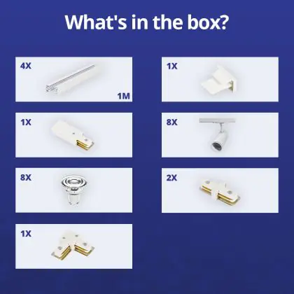 Beschreibung Komplettset 1-Phasen Rail L 2 x 2 Meter Weiß | incl. 8x Spot + GU10 2700K 3W Dimmbar + Abschlusskappe, Stromanschluss und L -Verbinder