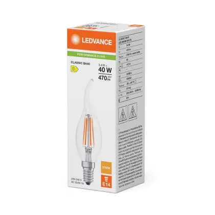 Die Ledvance Classic LED E14 Kerze Fadenlampe Klar 3.4W 470lm - 827 Extra Warmweiß | Ersatz Für 40W ist eine effiziente E14 LED-Lampe mit Retrodesign und der perfekte Ersatz für Ihre konventionellen 40W Lampen mit E14. Zudem strahlt sie Licht in der Farbtemperatur aus und punktet durch eine lange Lebensdauer.