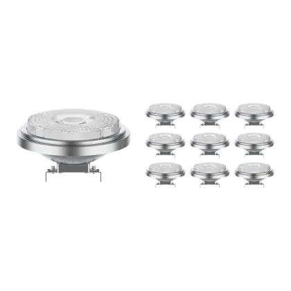 Die Mehrfachpackung 10x Noxion LED-Spot G53 AR111 7.4W 450lm 40D - 927 Extra Warmweiß | Höchste Farbwiedergabe - Dimmbar - Ersatz für 50W ist eine effiziente G53 LED-Lampe und der perfekte Ersatz für Ihre konventionelle Halogenlampe mit 50W und einem G53-Sockel, bei dem die beiden Stifte einen Abstand von 53 mm zueinander haben. Die Abkürzung AR111 zeigt Ihnen, dass der Reflektor einen Durchmesser von 11 cm hat. Zudem strahlt das Produkt Licht in der Farbtemperatur 2700K - Extra Warmweiß aus und punktet durch eine lange Lebensdauer.