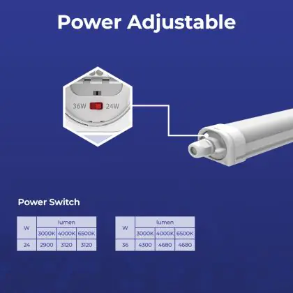 Die LED-Feuchtraumleuchte kommt mit der Farbtemperatur 3000K - 4000K - 6500K CCT daher. Als Faustregel gilt: Je niedriger der Kelvinwert, desto gemütlicher wirkt das Licht.