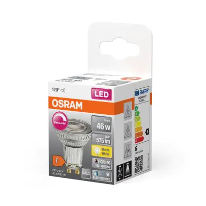 Die Osram LED Superstar Reflektor Spot GU10 PAR16 6W 575lm 120D - 927 Extra Warmweiß | Höchste Farbwiedergabe - Dimmbar - Ersatz Für 46W ist eine effiziente GU10 LED-Lampe und der perfekte Ersatz für Ihre konventionelle Halogenlampe mit 46W und einem GU10-Sockel, bei welchem die zwei Stifte einen Abstand von 10 mm zueinander haben. Zudem strahlt das Produkt Licht in der Farbtemperatur 2700K - Extra Warmweiß aus und punktet durch eine lange Lebensdauer.