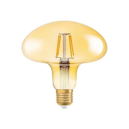 Die Osram Vintage 1906 LED E27 Mushroom 4.5W 825 Gold | Ersetzt 40W ermöglicht enorme Energieeinsparungen von bis zu 90 %. Dank des Standard-E27-Sockels klappt der Umstieg auf LED besonders einfach. Die Goldbeschichtung und die sichtbaren Filamentstäbe im Inneren des Leuchtkörpers machen die Vintage-LED zu einem echten Highlight. Der Leuchtkörper ist begeistert mit einer Pilz-Form.