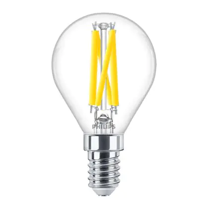 Die Philips MASTER LED E14 Kugel Fadenlampe Klar 3.4W 470lm - 922-927 Dim To Warm | Höchste Farbwiedergabe - Dimmbar - Ersatz Für 40W ist eine effiziente E14 LED-Lampe mit Retrodesign und der perfekte Ersatz für Ihre konventionellen 40W Lampen mit E14. Zudem strahlt sie Licht in der Farbtemperatur 2200K - 2700K Dim To Warm aus und punktet durch eine lange Lebensdauer.